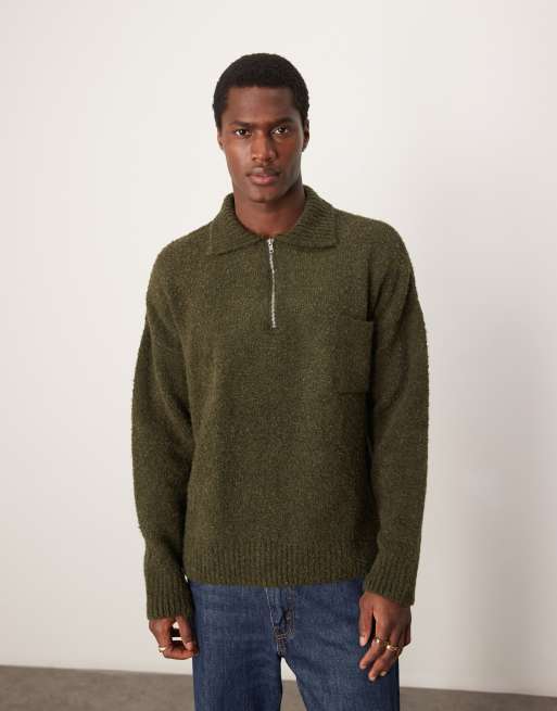 ASOS DESIGN – Strukturierter Polo-Strickpullover in Khaki mit kastigem Oversize-Schnitt, kurzem Reißverschluss und Brusttasche