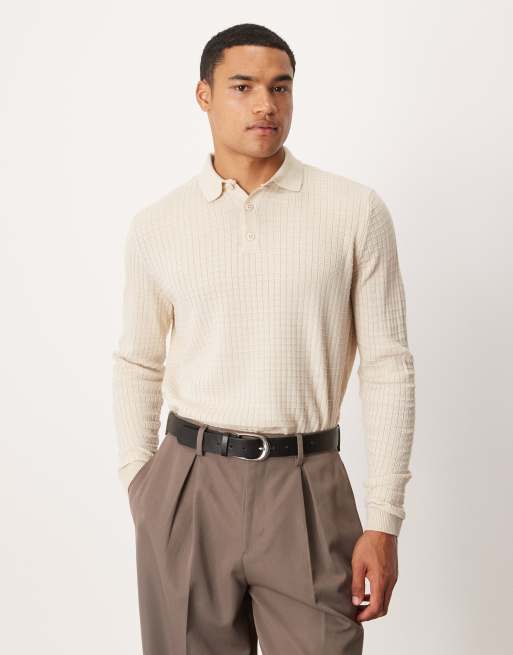 ASOS DESIGN – Strukturiertes, langärmliges Relaxed-Fit-Polohemd aus Strick in Stein