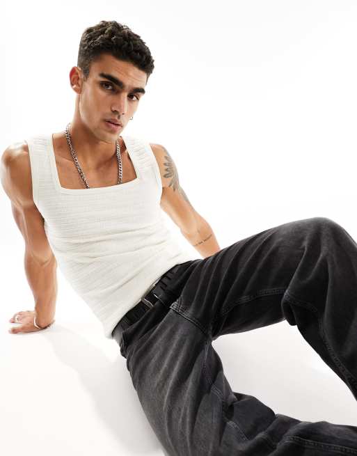ASOS DESIGN – Strukturiertes Muskel-Trägertop in Beige mit eckigem Ausschnitt