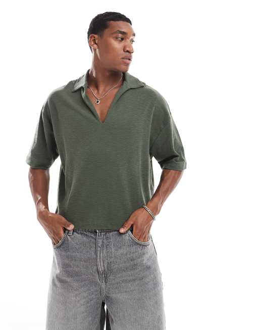 ASOS DESIGN – Strukturiertes Oversize-Polohemd in Khaki mit tiefem V-Ausschnitt