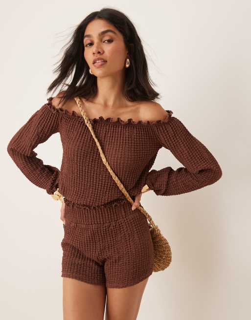 ASOS DESIGN – Strukturiertes Set in Braun, aus schulterfreiem Oberteil und Boxershorts mit gesmoktem Bund