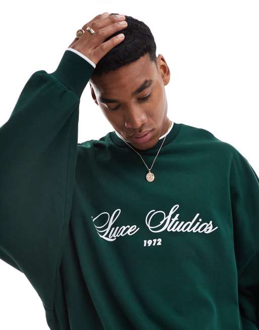 ASOS DESIGN – Super-Oversize-Sweatshirt in Dunkelgrün mit Rundhalsausschnitt und Textprint