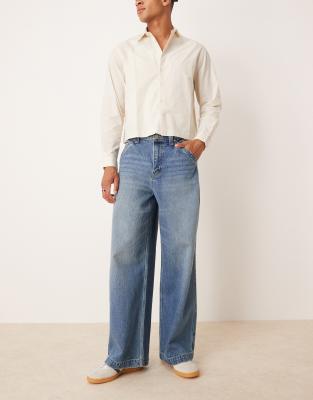 ASOS DESIGN – Super weite Jeans in mittelblauer Waschung mit bestickter Gesäßtasche