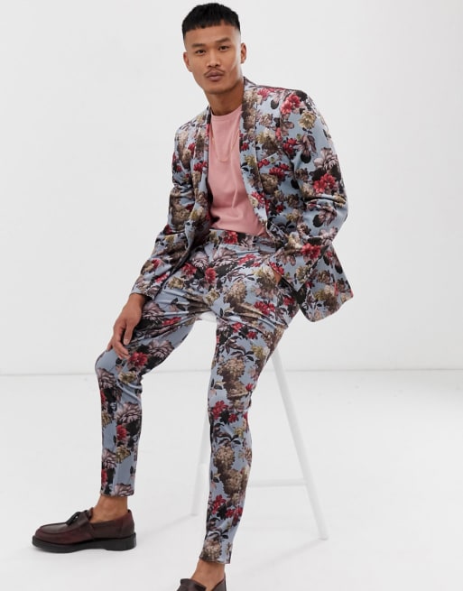 ASOS DESIGN – Superenger Samtanzug in Blau mit Blumendruck
