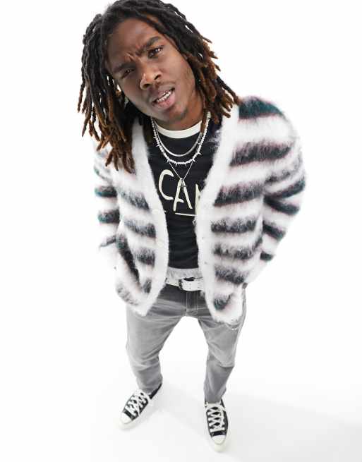 ASOS DESIGN – Superflauschige Oversize-Strickjacke in gestreiftem Weiß