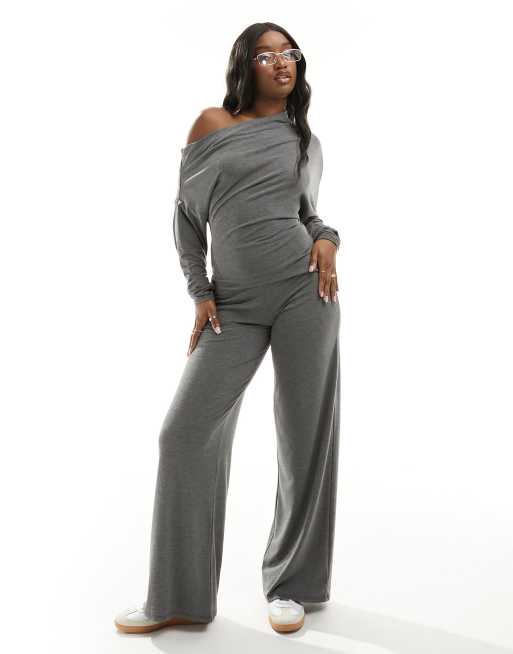 ASOS Design – Superweicher Jumpsuit in Grau mit fallender Schulterpartie, Overlay und weitem Bein