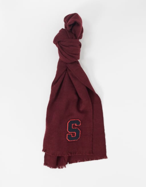 ASOS DESIGN – Superweicher, langer, gewebter Schal mit gesticktem „S“-Aufnäher im Collegestil, Burgunderrot