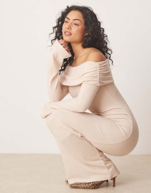 ASOS DESIGN – Superweiches, asymmetrisches, schulterfreies Maxikleid in Hellbeige