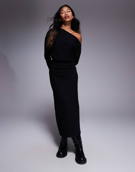 ASOS DESIGN – Superweiches, langärmliges Midikleid in Schwarz mit abfallender Schulterpartie