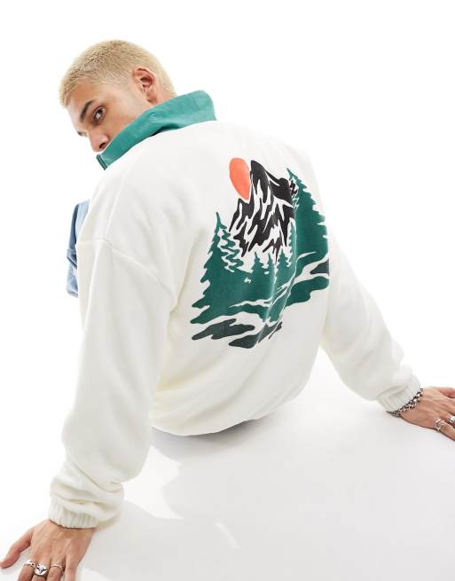 ASOS DESIGN – Sweatshirt aus Polar-Fleece mit Bergprint auf der Rückseite und kurzem Reißverschluss
