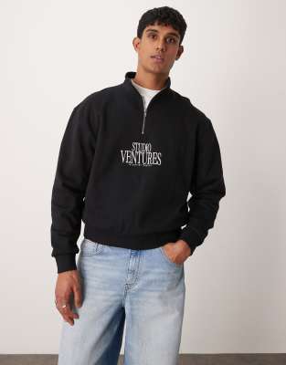 ASOS DESIGN – Sweatshirt in Schwarz mit Stehkragen, kastigem Schnitt und Print auf der Brust