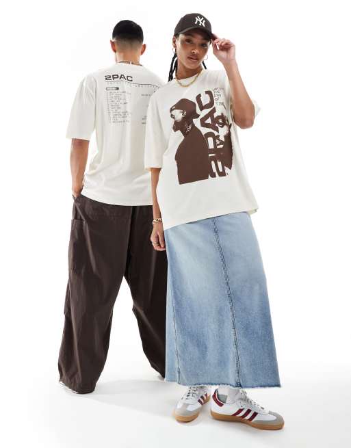 ASOS DESIGN – T-Shirt in Beige mit Oversize- und Unisex-Passform und lizenziertem, farblich abgestimmtem Tupac-Grafikprint vorne