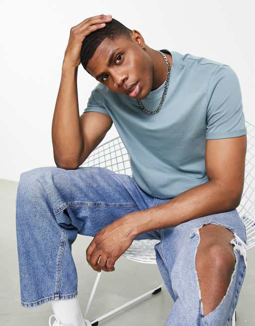 ASOS DESIGN – T-Shirt in verwaschenem Blau mit Rollärmeln