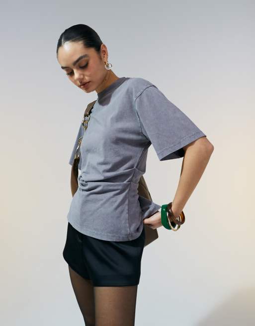 ASOS DESIGN – T-Shirt in verwaschenem Grau mit Korsett-Taille