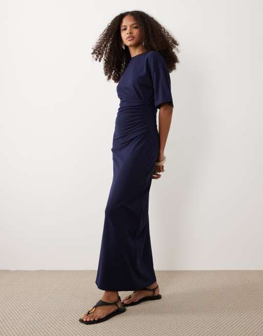 ASOS DESIGN – T-Shirt-Maxikleid in Marineblau mit gerafften Seiten