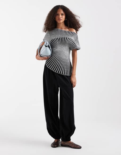 ASOS DESIGN – Tailliertes, plissiertes Strickoberteil in Schwarz-Weiß gestreift