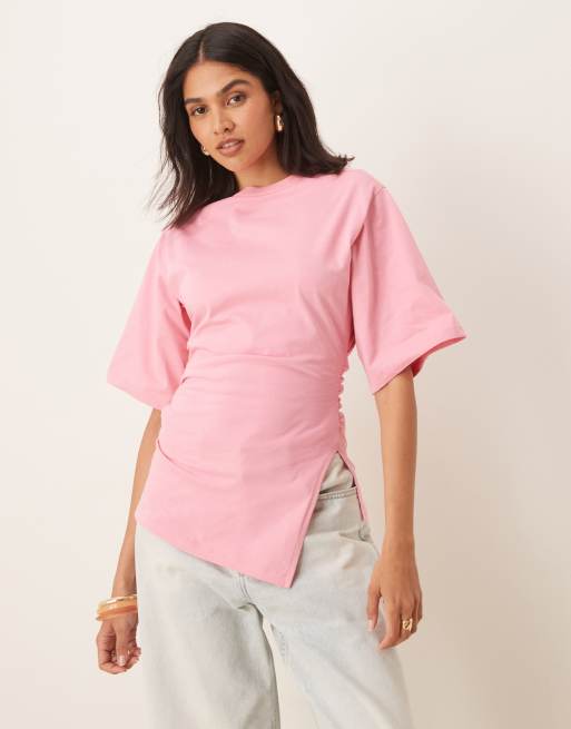 ASOS DESIGN – Tailliertes T-Shirt in Rosa mit asymmetrischem Saum