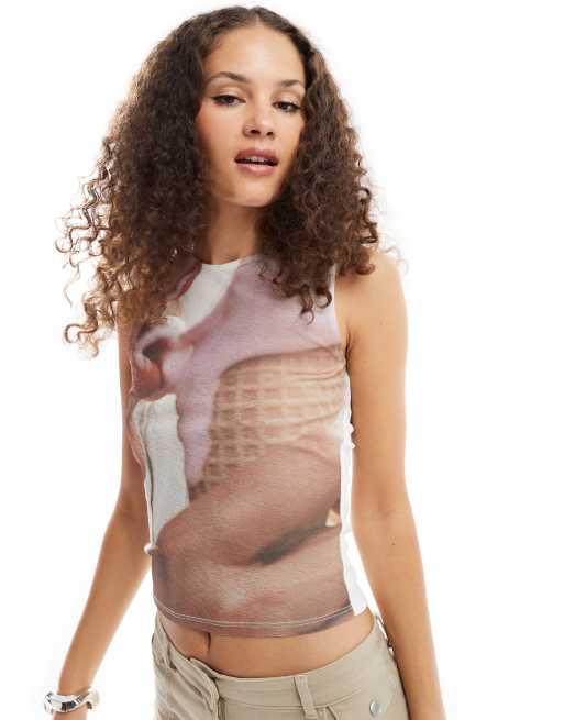 ASOS DESIGN – Tanktop aus Netzstoff in der Farbe Eiscreme mit Lippengrafik