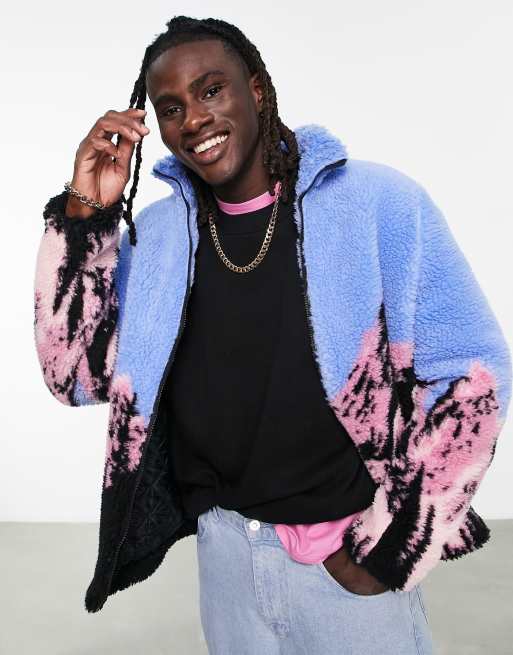 ASOS DESIGN – Teddyfell-Jacke im Wanderer-Stil mit Landschaftsmuster