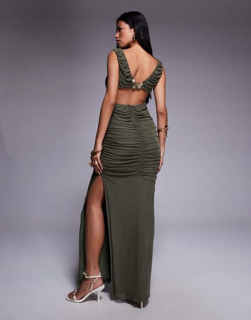 ASOS DESIGN – Tief ausgeschnittenes Netzstoff-Maxikleid in Khaki mit Rückenausschnitt und goldenem Schmetterlingsbesatz