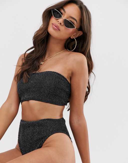 ASOS DESIGN – Trägerloses Crinkle-Bikinioberteil in Schwarz- und Silber-Metallic