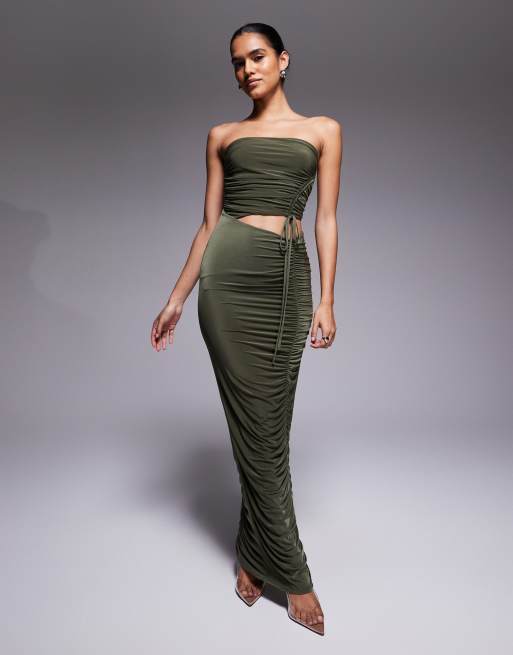 ASOS DESIGN – Trägerloses, gerafftes Maxikleid in Khaki