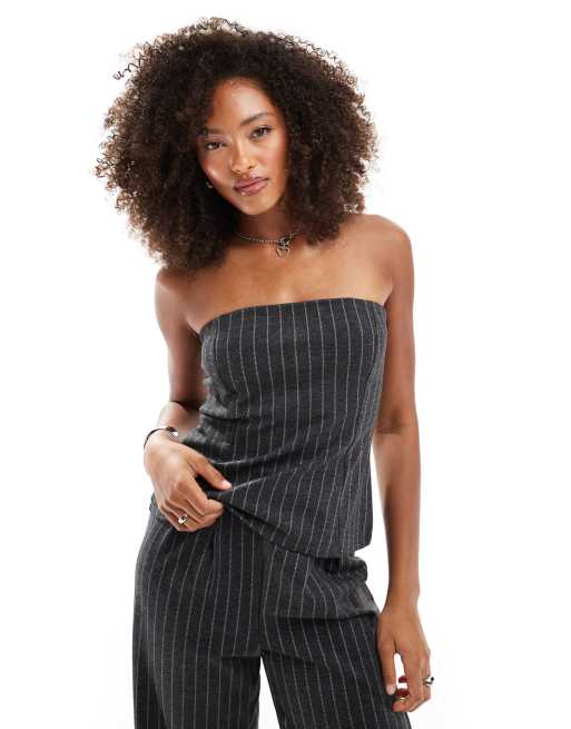 ASOS DESIGN – Trägerloses Longline-Oberteil in Grau mit Nadelstreifen