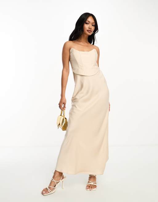 ASOS DESIGN – Trägerloses Maxikleid in Goldoptik mit Korsettdetail und abgesetztem Stoffunterrock