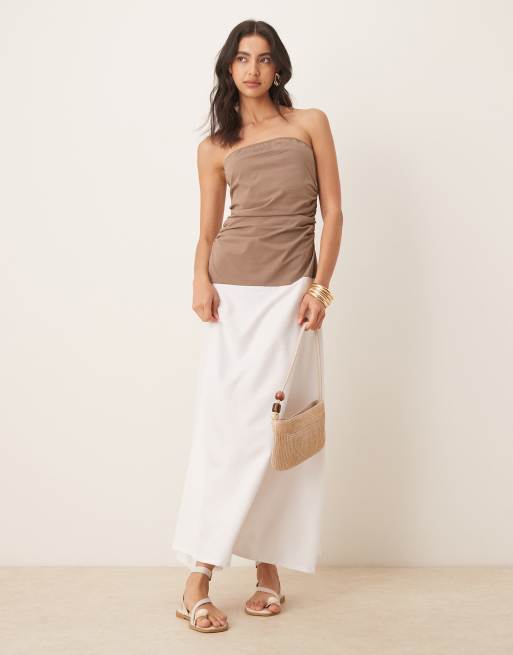 ASOS DESIGN – Trägerloses Midikleid in Mokka mit Popeline-Rock in Weiß