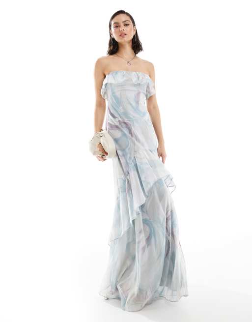 ASOS DESIGN – Trägerloses Midikleid mit Rüschen und abstraktem Muster