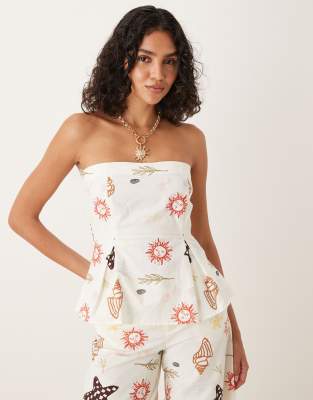 ASOS DESIGN – Trägerloses Oberteil aus Leinenmix mit aufgedruckten Urlaubsmotiven und abgenähter Taillenpartie, Kombiteil