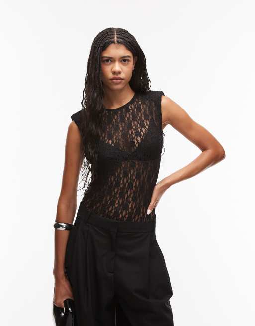 ASOS DESIGN – Transparenter Spitzenbody in Schwarz mit Schulterpolstern