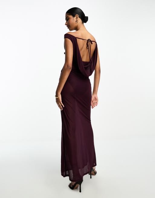 ASOS DESIGN – Transparentes Bardot-Maxikleid in Pflaumenlila mit Wasserfallausschnitt am Rücken