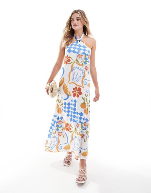 ASOS DESIGN – Trapez-Midikleid mit Neckholder, Knotendetail und Postkarten-Print
