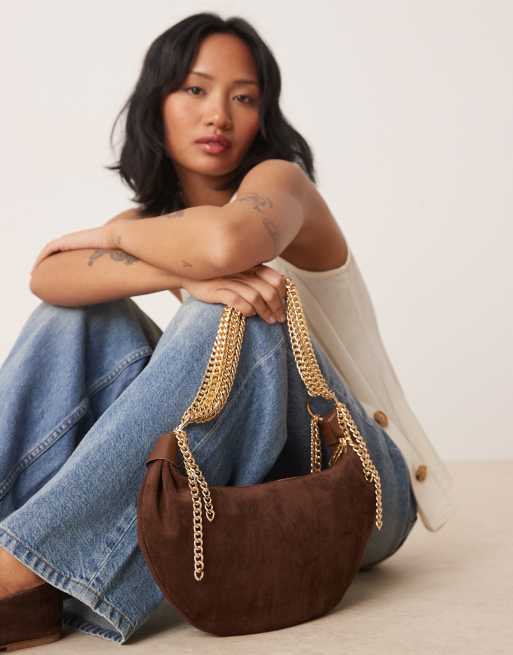 ASOS DESIGN – U-förmige Schultertasche aus Wildlederimitat in Schokobraun mit auffälligem Kettenriemen