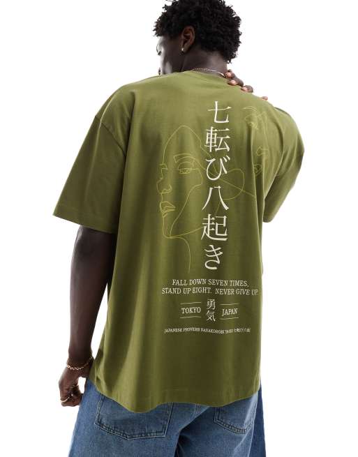 ASOS DESIGN – Übergroßes T-Shirt in Khaki mit Print entlang der Wirbelsäule