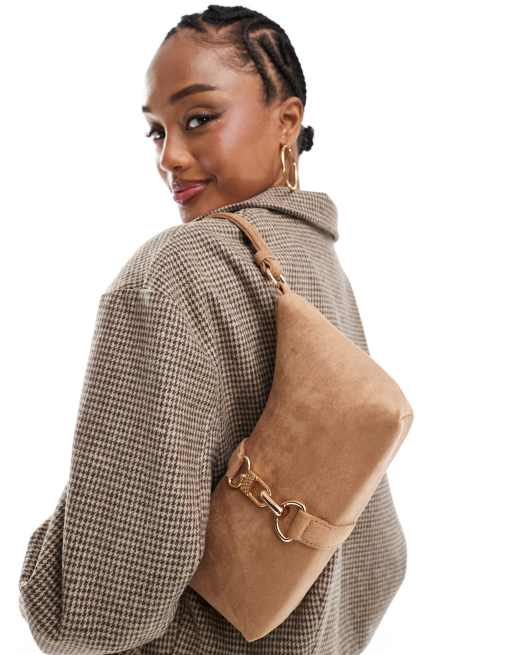 ASOS DESIGN – Umhängetasche aus Wildlederimitat in Hellbraun mit Karabinerhaken-Detail