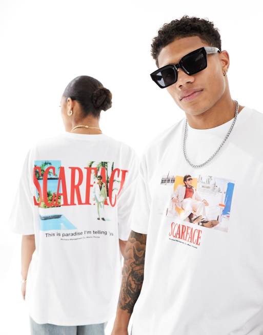 ASOS DESIGN – Unisex-T-Shirt in Weiß mit Unisex-Schnitt und lizenziertem „Scarface“-Grafikprint