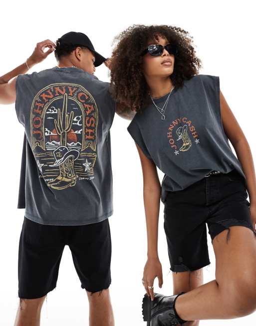 ASOS DESIGN – Unisex-Trägertop in verwaschenem Schwarz mit Oversize-Schnitt und „Johnny Cash“-Grafikprints