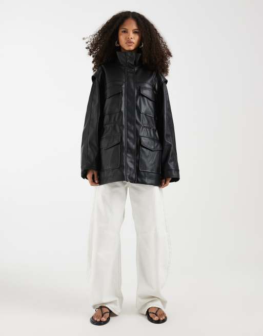 ASOS DESIGN – Utility-Jacke aus Kunstleder in Schwarz mit vier Taschen