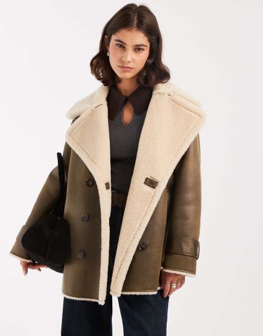 ASOS DESIGN – Verstärkte Oversize-Pilotenjacke in Khaki mit Teddyfell