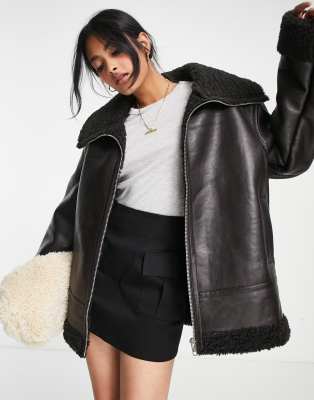 ASOS DESIGN – Verstärkte Pilotenjacke aus dunkelbraunem Kunstleder mit Teddyfellbesatz