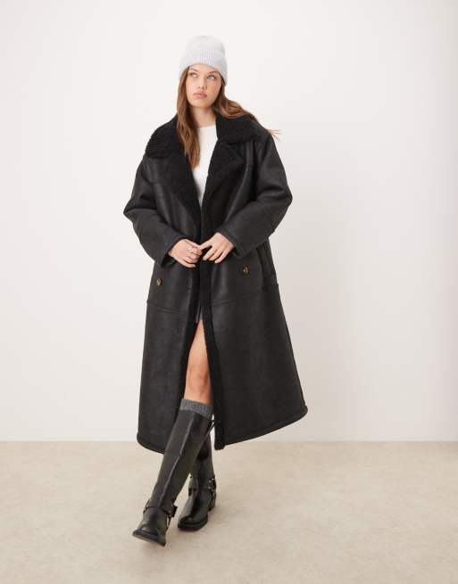 ASOS DESIGN – Verstärkter Longline-Trenchcoat in Schwarz mit Teddyfell