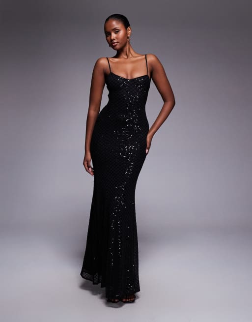 ASOS DESIGN – Verziertes Maxikleid in Schwarz mit gitterartigem Paillettenbesatz und Schnürung am Rücken