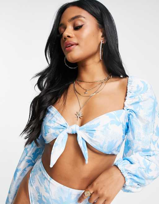 ASOS DESIGN – Vorn gebundenes, langärmliges Bikinioberteil in Blau mit Blumenmuster