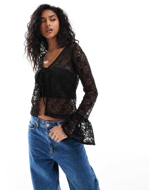 ASOS DESIGN – Vorne gebundenes Oberteil aus Spitze in Schwarz