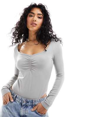 ASOS DESIGN – Vorne geraffter, langärmliger Body in Grau mit eckigem Ausschnitt