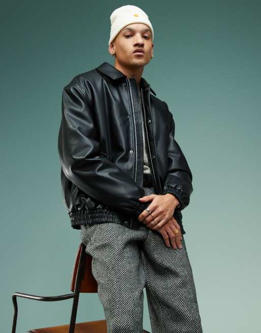 ASOS DESIGN – Wattierte Harrington-Jacke aus Kunstleder in Schwarz mit Oversize-Passform