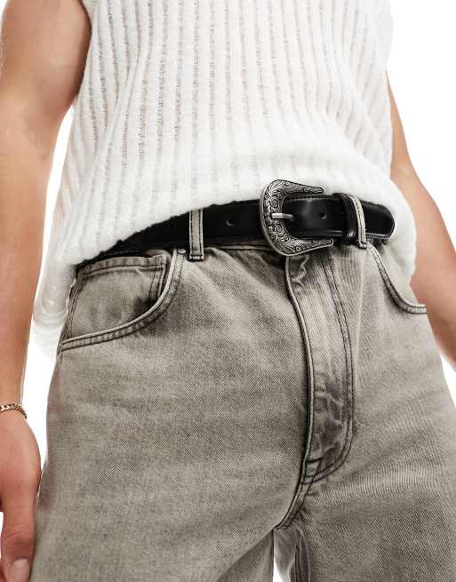 ASOS DESIGN – Webgürtel aus Leder in Schwarz mit Westernschnalle