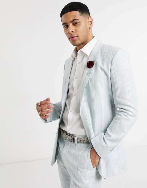 ASOS DESIGN Wedding – Anzugjacke mit engem Schnitt aus Stretch-Leinen in blau und weiß gestreift